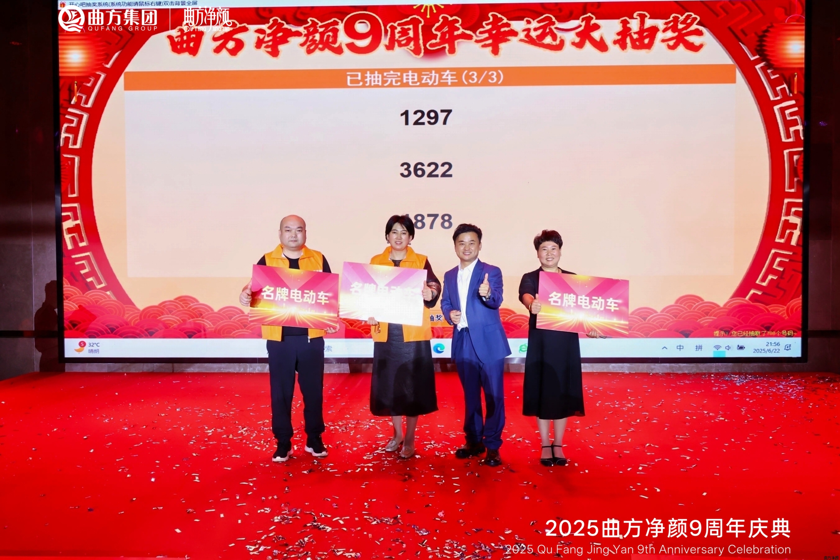 活动尾声,两轮重磅抽奖环节将现场氛围推向顶点。随着大屏幕滚动的幸运号码闪烁,欢呼声与期待交织成浪潮。当主持人揭晓终极大奖时,电动车、洗衣机、电视机等豪华奖品逐一亮相,中奖者在全场瞩目中高举奖券,难掩惊喜笑容;而幸运奖得主们同样收获满满,手持实用好礼,喜悦之情溢于言表。缤纷奖品不仅为活动画上圆满句号,更承载着曲方净颜对合作伙伴的诚挚回馈,让这份幸运与喜悦成为今夜最闪耀的记忆。